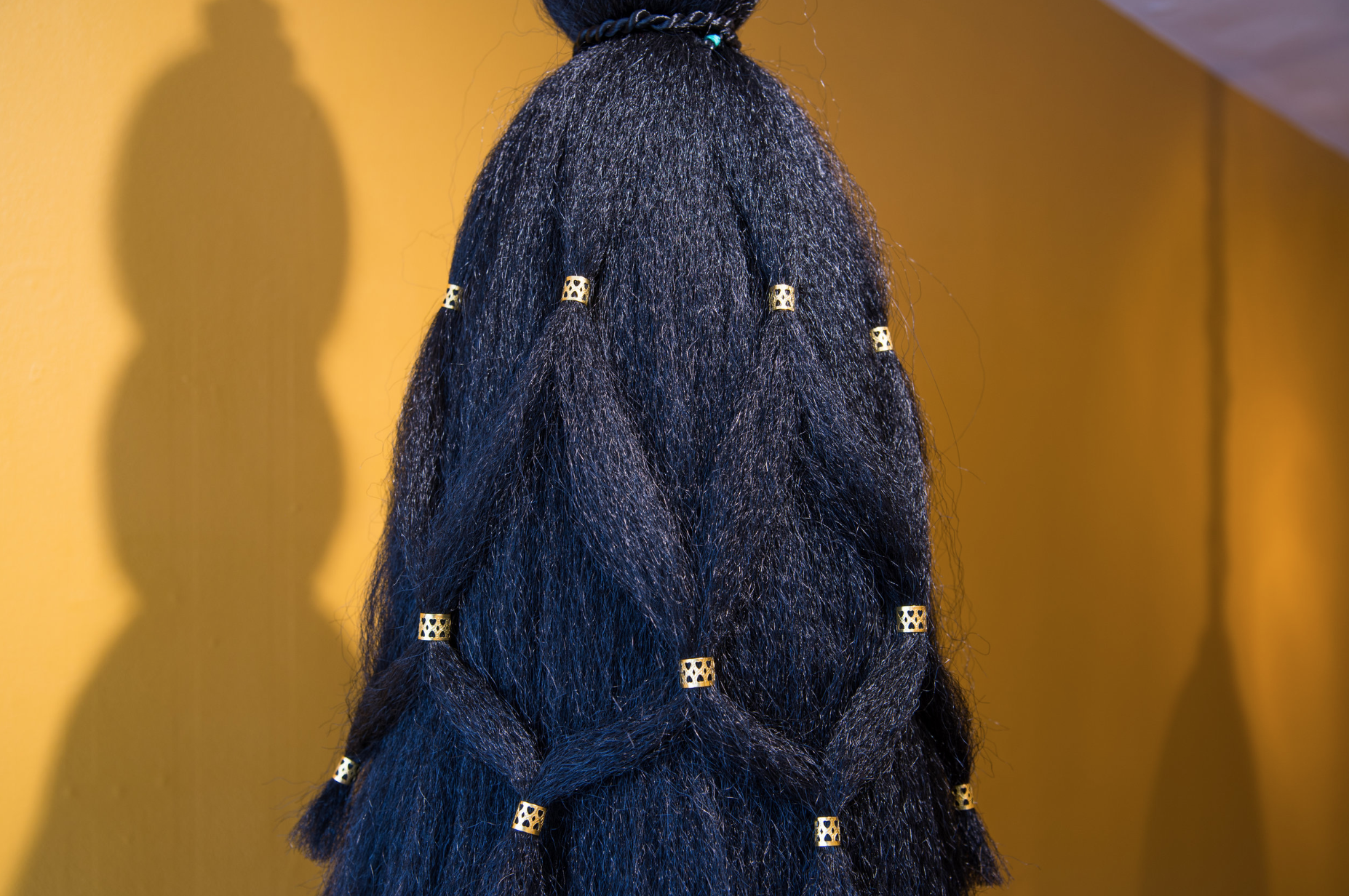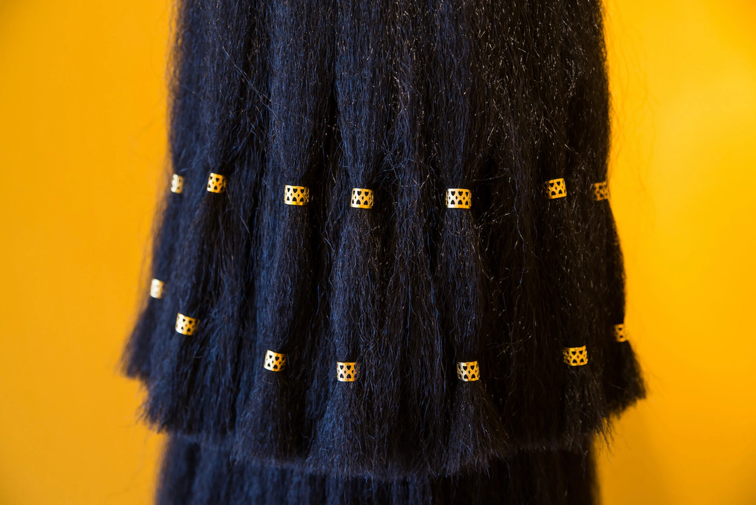 The tassel is a symbol of power and prestige. As a decorative object it has historically been used to embellish garments, and has been worn by priests, monks, and military officers to differentiate hierarchy while simultaneously warding off evil spirits. As a functional object, tassels are used to prevent unraveling. Similarly, we often view our hair as having the ability to hold us together. As young Black and Latina women we have been made aware that there is an expectation that must be met regarding the presentation of our hair. The extent to which hair is maintained can often be read as a reflection of other aspects of life. This work ties together the chronology, wisdom and adornment that is present in the history of both hair and tassels.